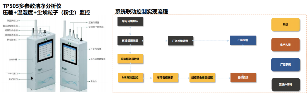 拓普瑞TP505潔凈度分析儀是業(yè)內(nèi)首款在線式集塵埃粒子、溫濕度、壓差、露點溫度、風速等6種可測參數(shù)、11個數(shù)值顯示為一體 滿足了鋰電池生產(chǎn)過程中的各種環(huán)境測試,并具備了與廠房控制系統(tǒng)對接,MES制造執(zhí)行系統(tǒng)對接,具有開放式的對接協(xié)議,不需要再配其它儀表以及二次開發(fā)。
