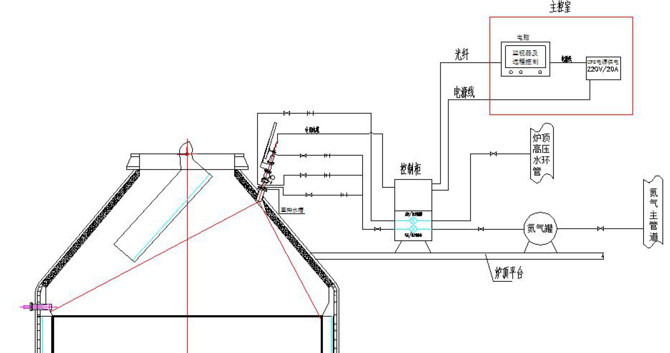 高爐爐頂熱成像系統(tǒng)由爐體安裝件、高溫紅外鏡頭、高清專用熱像儀、攝像槍體、水冷卻裝置、氮?dú)饫鋮s裝置、鏡頭吹掃裝置、鏡頭刮掃裝置、高溫電動(dòng)隔離裝置、自動(dòng)進(jìn)入/退出機(jī)構(gòu)、自動(dòng)刮掃裝置、控制系統(tǒng)、溫度傳感器、壓力傳感器等、控制柜、工控機(jī)及通信網(wǎng)絡(luò)等組成。