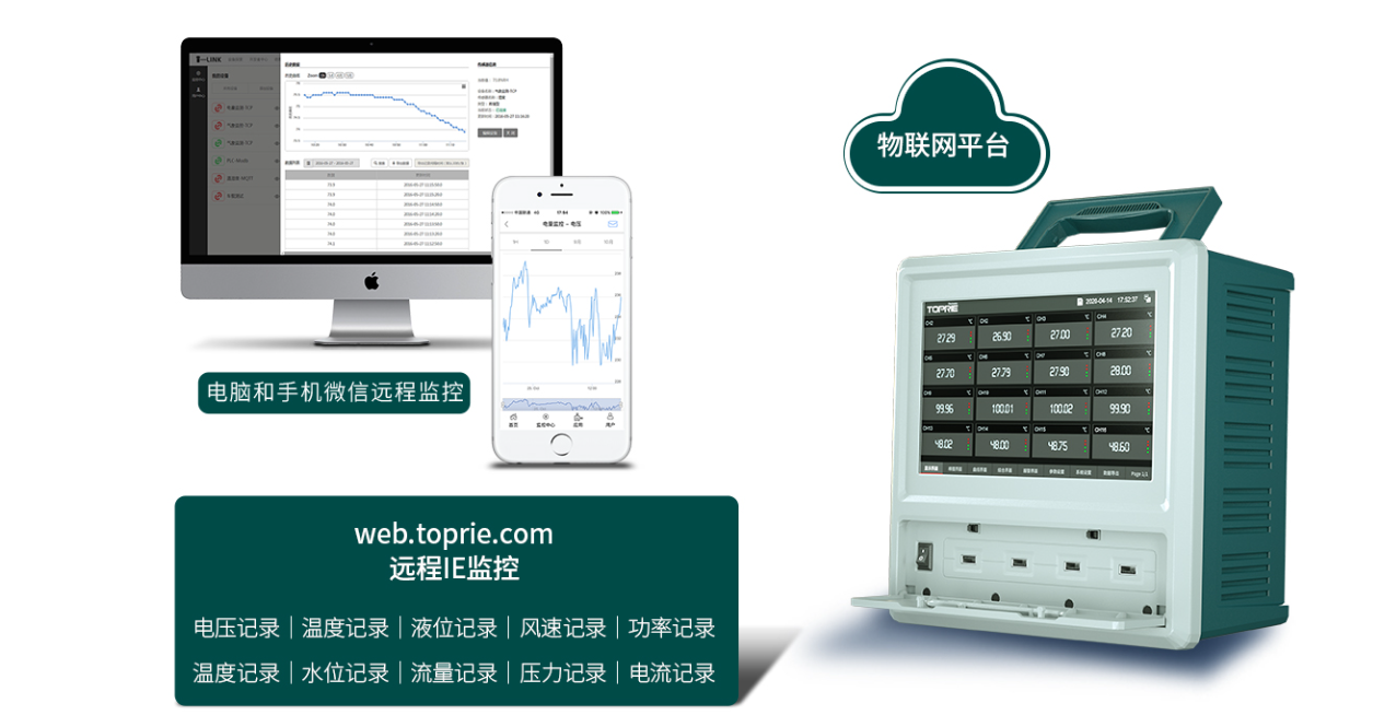 TP1000多通道數(shù)據(jù)記錄儀可以收集并記錄下以上的這些數(shù)據(jù),數(shù)據(jù)監(jiān)控中心安裝上我們的數(shù)據(jù)監(jiān)控系統(tǒng)軟件,通過串口通訊或以太網(wǎng)通訊方式可以把這些數(shù)據(jù)傳送到監(jiān)控中心,也可以通過G無線將數(shù)據(jù)發(fā)送到云監(jiān)控平臺,操作人員可以通過手機APP或微信小程序進行云平臺數(shù)據(jù)遠程查看,幫助操作員了解電站的實時運行狀況。