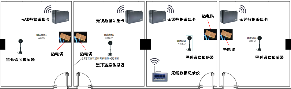 無線數(shù)據(jù)采集卡:總共4個房間,每個房間放置1個。用來采集每個房間的熱電偶溫度以及黑球溫度傳感器的數(shù)據(jù),將采集到的數(shù)據(jù)無線發(fā)送出去到無線采集器上面。