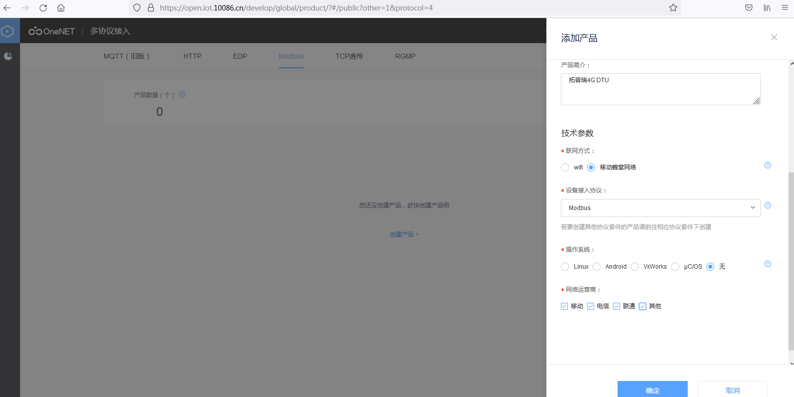 1、創(chuàng)建產(chǎn)品.選擇多協(xié)議接入,創(chuàng)建產(chǎn)品時(shí)網(wǎng)絡(luò)選擇蜂窩移動(dòng)網(wǎng),協(xié)議選modbus.