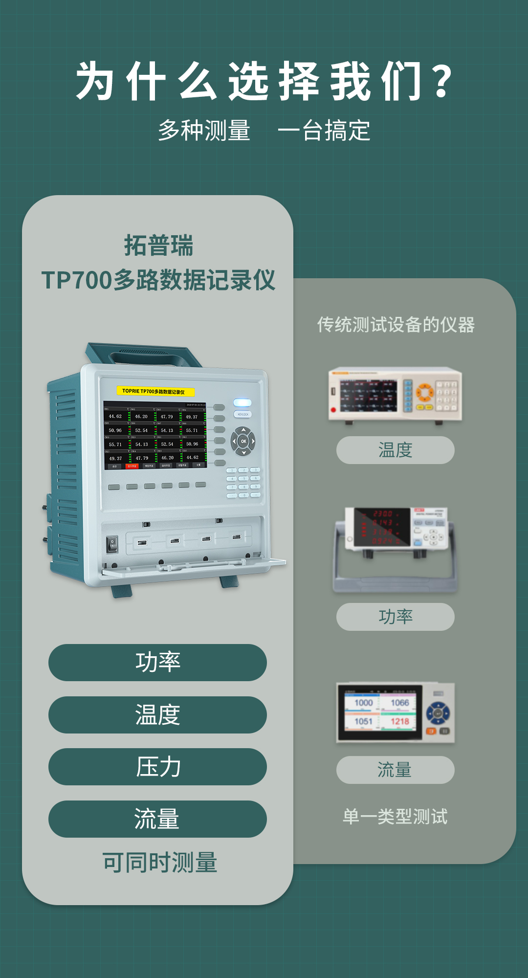 TP700多路數(shù)據(jù)記錄儀的多功能測試在廚電方面的使用與測試得到完美體現(xiàn),有別與市場上其它單一類型的測試儀器。如果采用傳統(tǒng)的方案測試一臺咖啡機的功率,溫度,壓力,流量等參數(shù),我們需要配置至少兩臺或以上的測試儀器,采用拓普瑞TP700多路數(shù)據(jù)記錄儀一臺機就可以全部搞定。