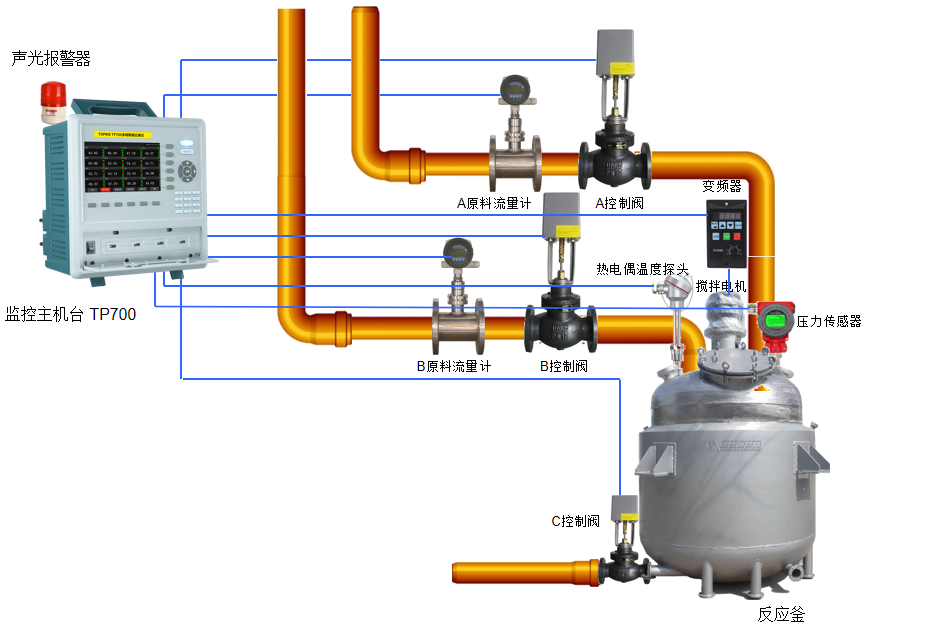 它是由TP700多路數(shù)據(jù)記錄儀,控制電源,繼電器模塊,電磁流量計(jì),電動閥門,壓力傳感器,溫度傳感器,報(bào)警器,變頻器,攪拌電機(jī)等組成。