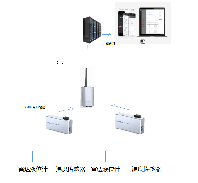 儲(chǔ)油罐液位、溫度在線監(jiān)測(cè)系統(tǒng)采用拓普瑞TP1608無線采集器和4G DTU為監(jiān)測(cè)現(xiàn)場(chǎng)核心設(shè)備。拓普瑞TP1608無線采集器采集液位計(jì)、溫度變送器的4~20mA輸出信號(hào)并通過4G網(wǎng)絡(luò)實(shí)時(shí)傳送給TLINK云平臺(tái)。