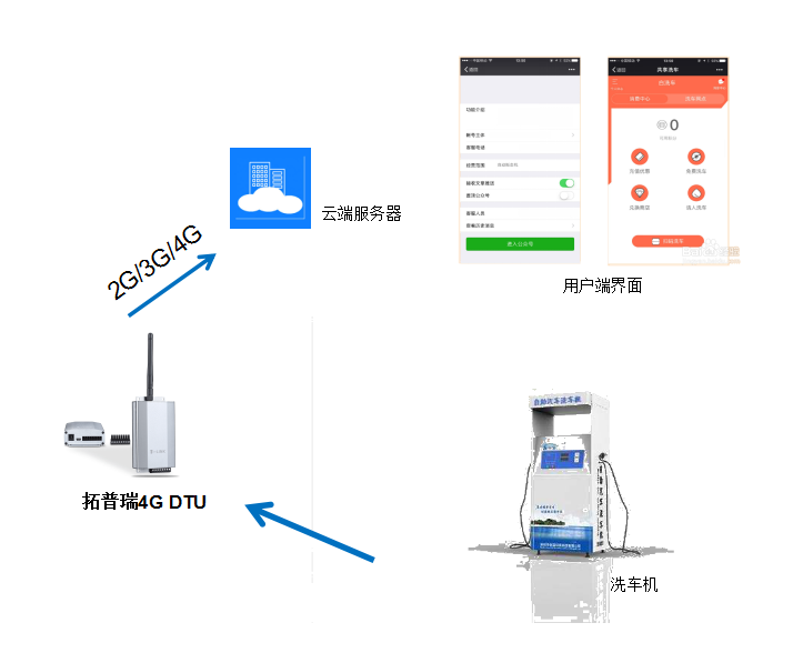 自助洗車機(jī)終端、拓普瑞4G DTU(TP301V4)、數(shù)據(jù)中心三大部分組成,自助洗車機(jī)的系統(tǒng)(工控機(jī))通過 RS232/RS485 接口與4G DTU(TP301V4)連接實(shí)現(xiàn)數(shù)據(jù)傳輸,與運(yùn)營商網(wǎng)絡(luò)建立連接,通過無線2G/3G/4G 網(wǎng)絡(luò)傳輸數(shù)據(jù)到服務(wù)器,可直接登陸平臺查看銷售金額,現(xiàn)場設(shè)備狀態(tài)等。