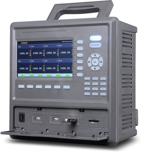 多通道數(shù)據(jù)記錄儀CPU內(nèi)的數(shù)據(jù)可經(jīng)顯示控制器顯示在液晶顯示屏上,一般可在7英寸或10.2英寸彩色液晶觸控屏上進(jìn)行顯示。操作人員通過操作按鍵或者觸摸屏進(jìn)行各種設(shè)定,信號(hào)傳送至CPU,使CPU按照操作人員的要求工作。當(dāng)被記錄的數(shù)據(jù)越限時(shí),CPU及時(shí)發(fā)出信號(hào)給報(bào)警電路,產(chǎn)生報(bào)警輸出。時(shí)鐘電路的作用是產(chǎn)生記錄儀所需的記錄時(shí)間間隔、時(shí)標(biāo)或日期等,傳送給CPU。