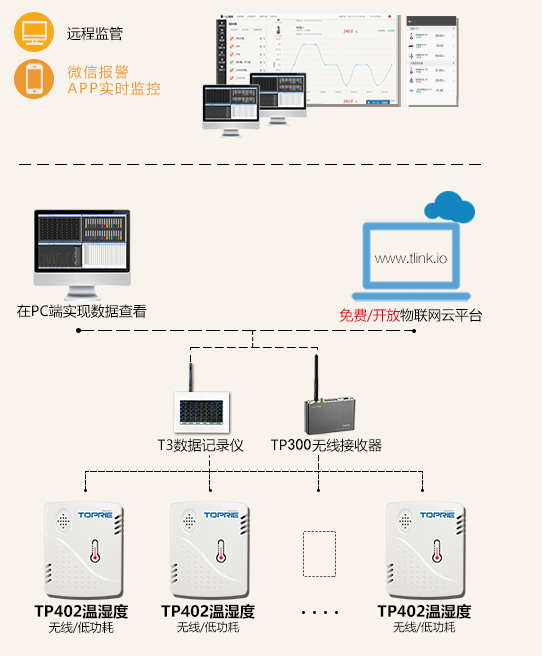 由低功耗溫濕度采集器TP402組成的溫濕度監(jiān)控系統(tǒng),大大減少了安裝使用以及維護(hù)成本,系統(tǒng)支持本地網(wǎng)絡(luò)數(shù)據(jù)存儲(chǔ)查看,也可實(shí)現(xiàn)云端數(shù)據(jù)存儲(chǔ)管理,